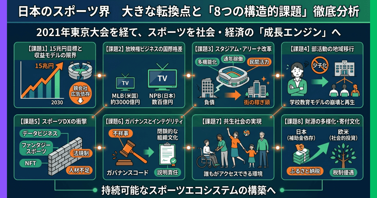 2026年、15兆円市場を目指す日本のスポーツ業界が直面する8つの課題を徹底解説。ガバナンス不全やDXの遅れをどう克服し、構造改革を断行すべきか?人的資本投資やスポーツ科学の知見を活かした、持続可能なビジネスモデルと収益化の正体に迫ります。